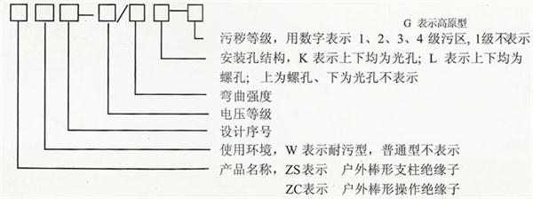 表示戶(hù)外棒形支柱絕緣子、普通型、設(shè)計(jì)序號(hào)為1、110kV電壓等級(jí)、4kN彎曲強(qiáng)度、上下法蘭均為螺孔、用于I級(jí)污區(qū)。