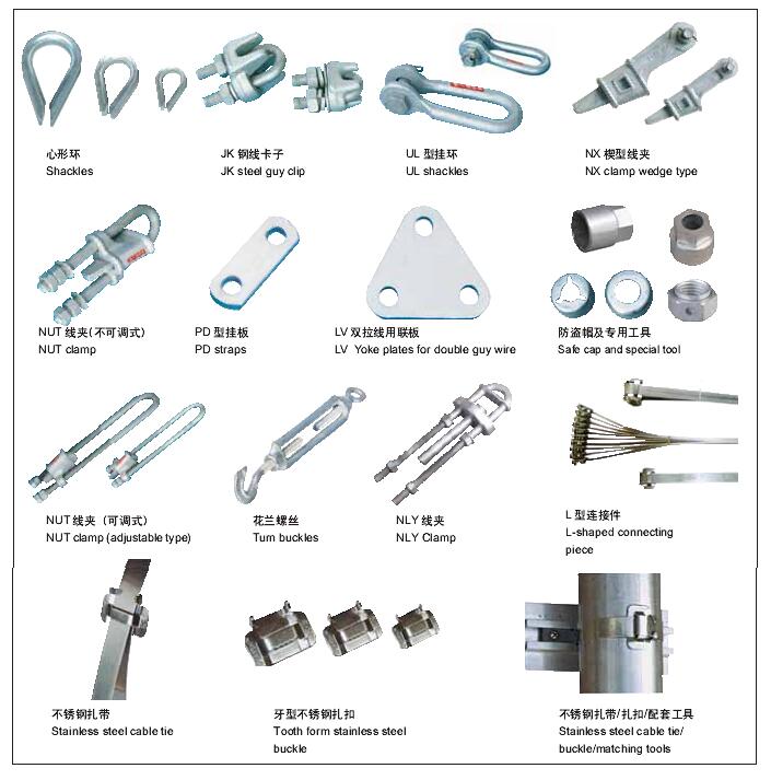 拉線金具:楔形線夾,UT型線夾,耐張線夾止退板,UT型線夾,拉線用U型掛環(huán),鋼線卡子,雙拉線用聯(lián)板,掛板,防盜帽,防盜螺母