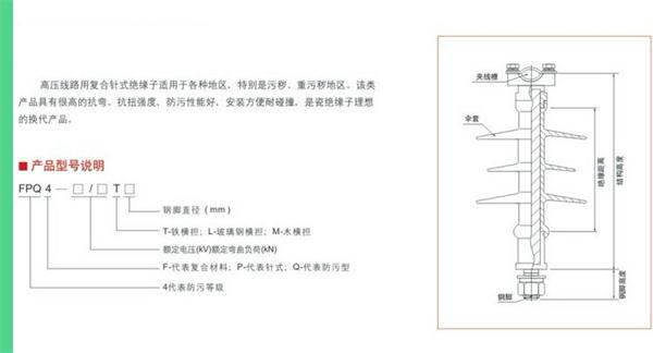 FPQ-10/5T20復合針式絕緣子復合針式絕緣子具有很高的抗彎曲,抗沖擊性、抗震性和防爆性能優(yōu)越。內(nèi)絕緣可靠、重量輕,是傳統(tǒng)電瓷的理想換代產(chǎn)品。 產(chǎn)品說明: